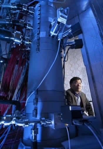 Dr. Xiaoqing Pan, Director of IMRI at UCI, with the lab's Nion UltraSTEM 200 HERMES scanning transmission electron microscope. Image Credit: IMRI