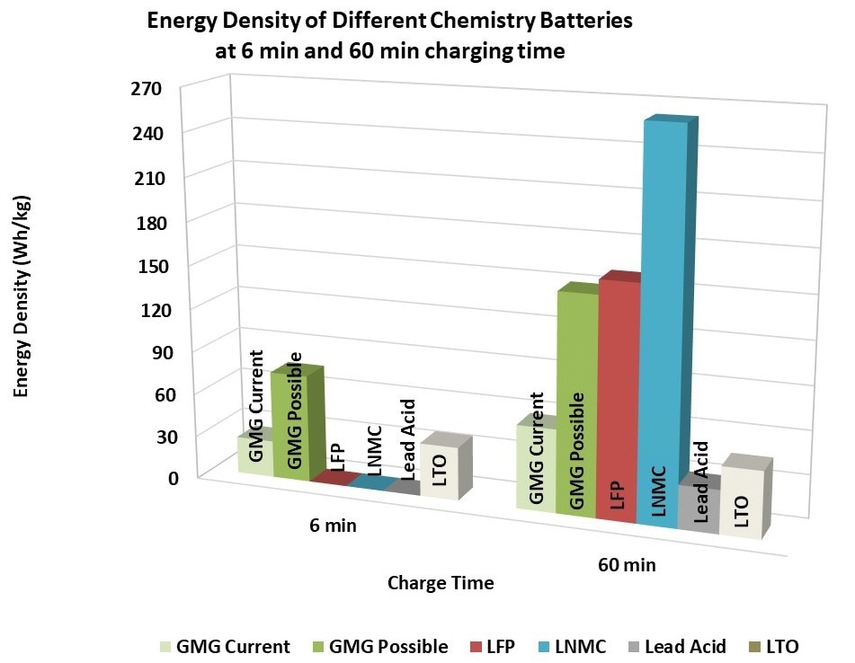 GMG management believes that the Company's battery technology can eventually achieve over 150 Wh/kg when charged in 1 hour, and over 75 Wh/kg when charged in 6 minutes. The Company believes further development of the cathode, anode, electrolyte and component weights will eventually achieve this end goal.
