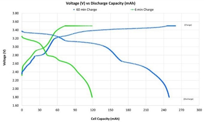 Figure 3. Battery performance curves of GMG's G+AI Battery at 60 min and 6 min charge. Image Credit: Graphene Manufacturing Group Ltd
