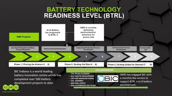 The battery technology readiness level ("BTRL") of the G+AI technology remains at Level 4, see Figure 5. GMG is currently optimizing electrochemical behavior for pouch cells via ongoing laboratory experimentation. Through collaboration with BIC, it is anticipated that the battery technology readiness will progress to BTRL 7 and 8 since the equipment and processes needed to produce the G+AI batteries are the same as those employed to make Lithium-Ion Batteries.